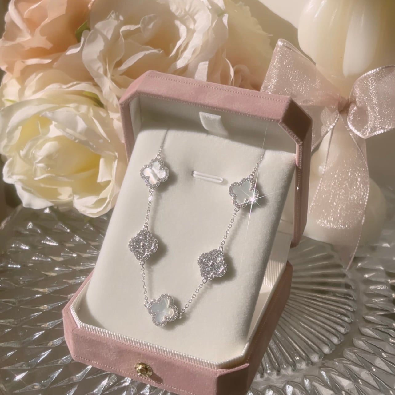 【商品説明】クローバーモチーフに贅沢にジルコニアとシェルが施された美しいブレスレットです。肌に優しく、日常から特別な日まで幅広くご使用いただけるスキンジュエリーとしておすすめです。輝きを放つデザインで、華やかさと存在感があります。