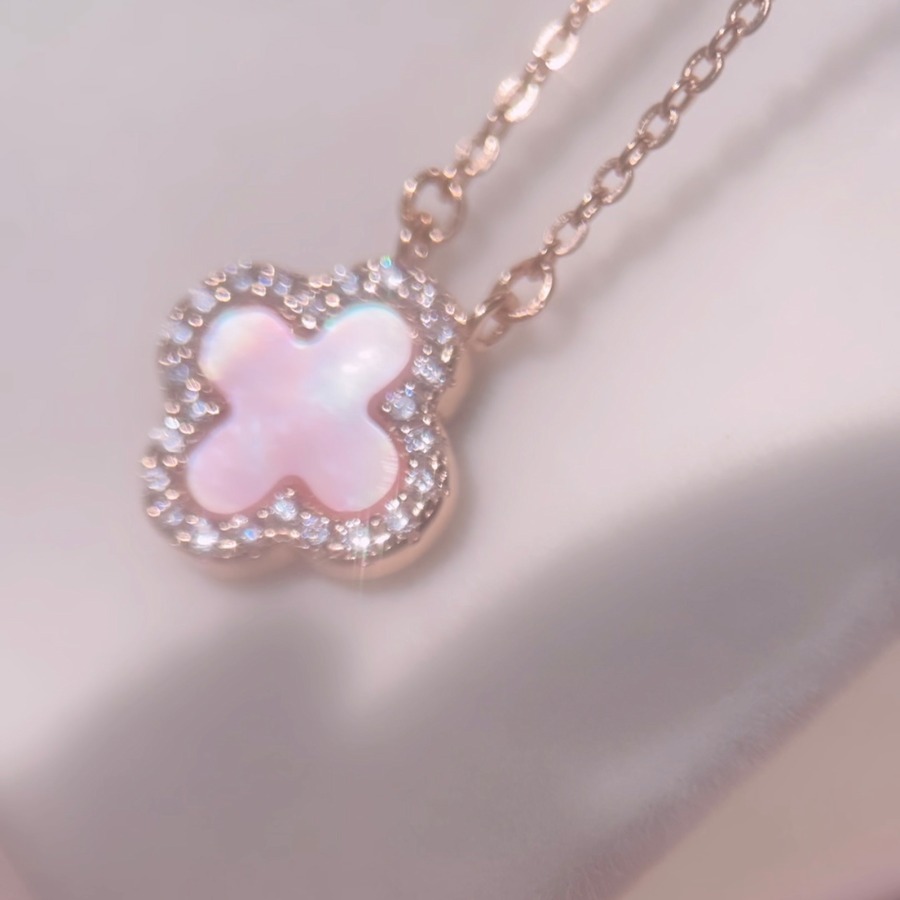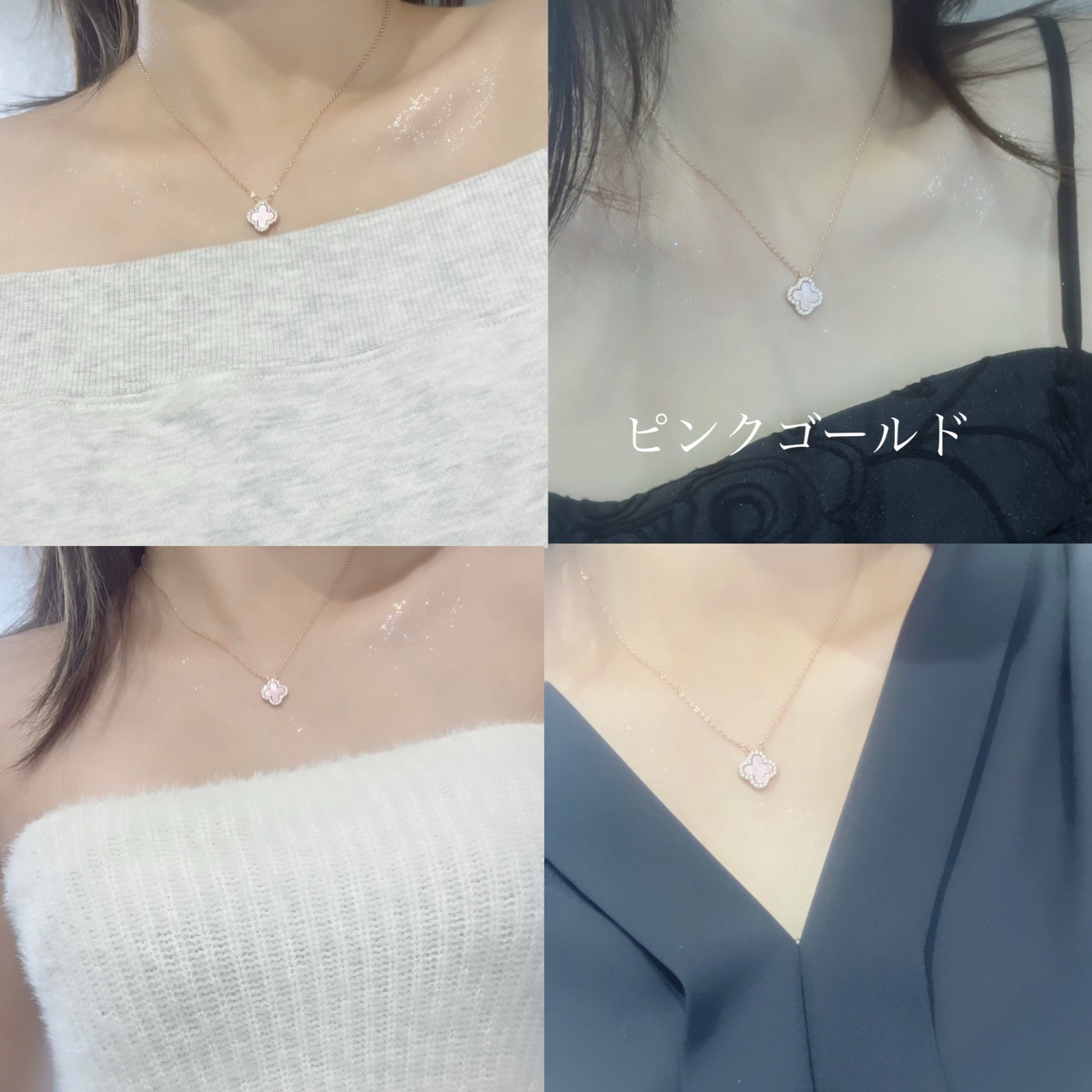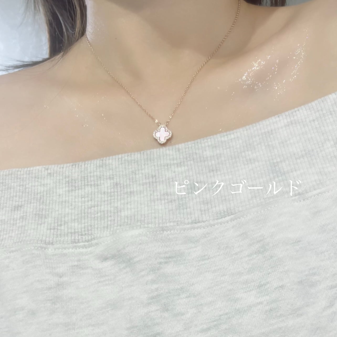 【商品説明】クローバーモチーフにジルコニアとピンクのシェルが施された美しいネックレスです。肌に優しく、日常から特別な日まで幅広くご使用いただけるスキンジュエリーとしておすすめです。輝きを放つデザインで、シンプルながらも存在感があります。
