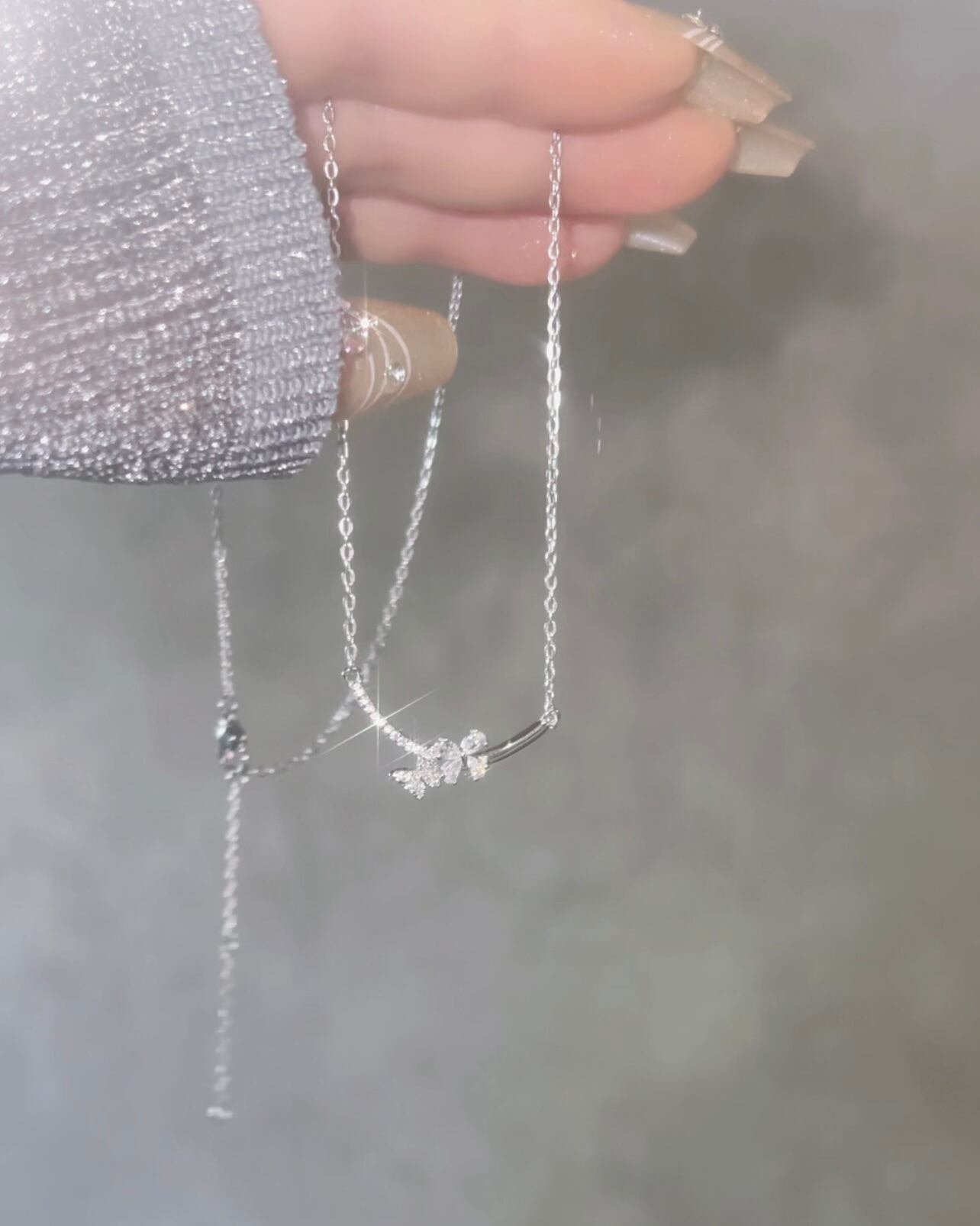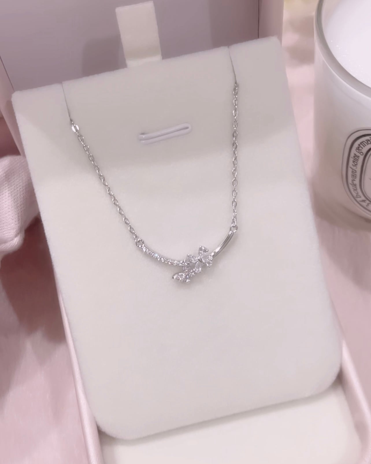 小さなバタフライとフラワーが施された愛らしいネックレスです。肌に優しく、日常から特別な日まで幅広くご使用いただけるスキンジュエリーとしておすすめです。輝きを放つデザインで、シンプルながらも存在感があります。