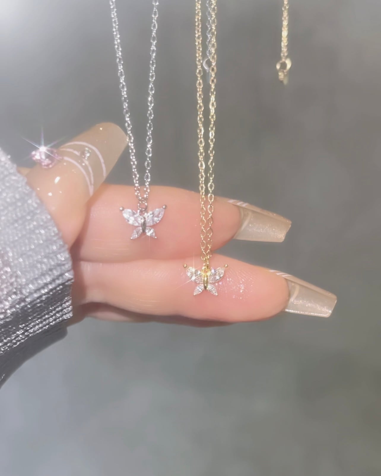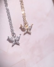 小さなバタフライにジルコニアが施された美しいネックレスです。肌に優しく、日常から特別な日まで幅広くご使用いただけるスキンジュエリーとしておすすめです。輝きを放つデザインで、シンプルながらも存在感があります。