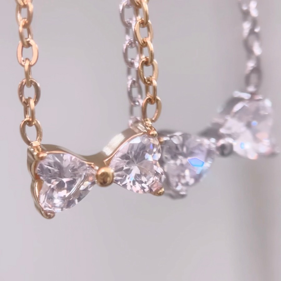 小さなリボンモチーフにジルコニアが施された美しいネックレスです。肌に優しく、日常から特別な日まで幅広くご使用いただけるスキンジュエリーとしておすすめです。輝きを放つデザインで、シンプルながらも存在感があります。