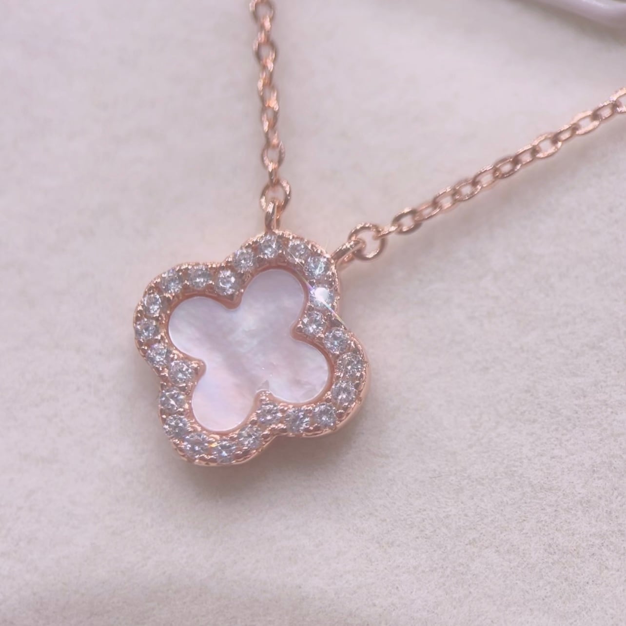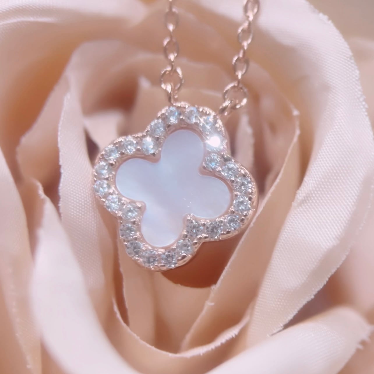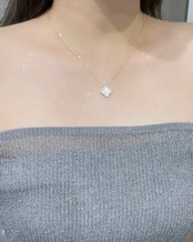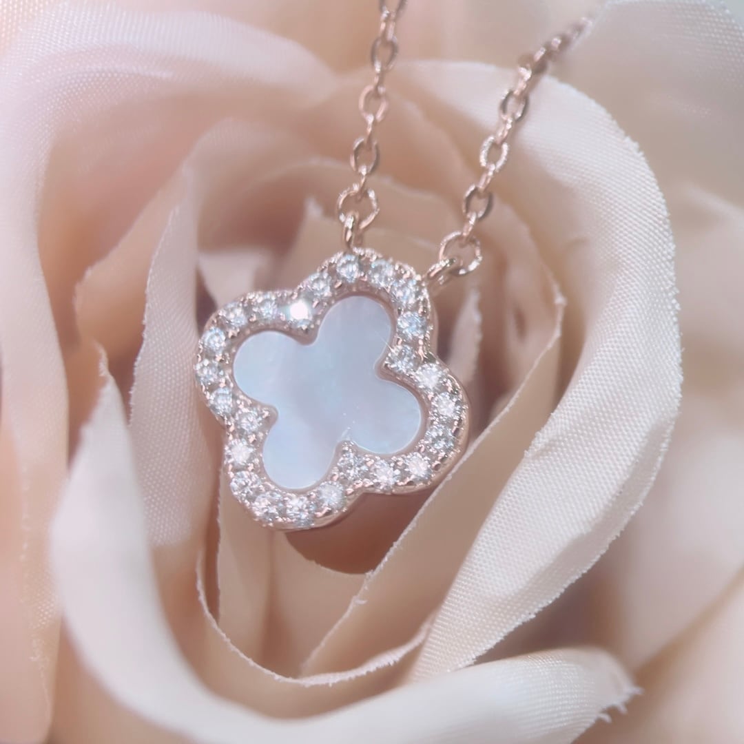 クローバーモチーフにジルコニアとホワイトシェルが施された美しいネックレスです。肌に優しく、日常から特別な日まで幅広くご使用いただけるスキンジュエリーとしておすすめです。輝きを放つデザインで、シンプルながらも存在感があります。