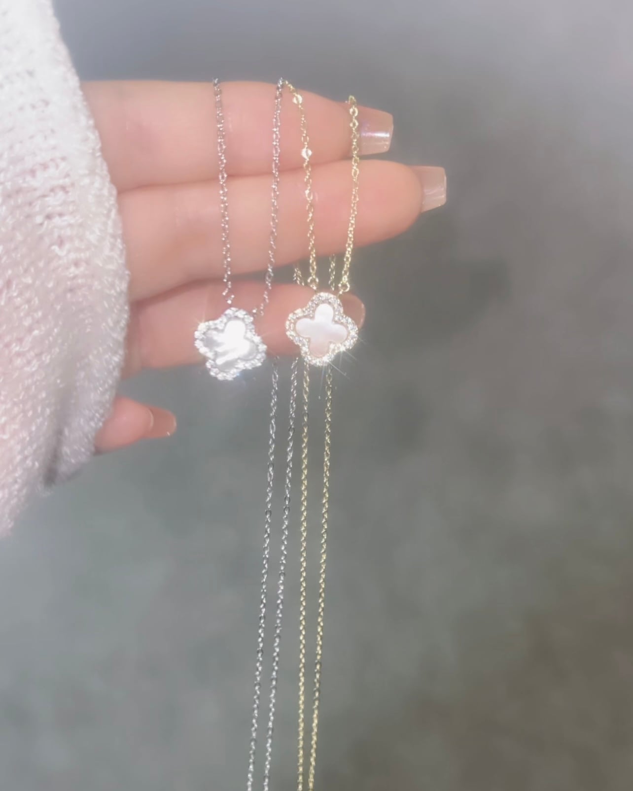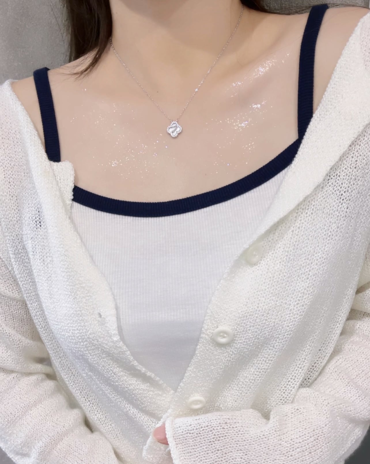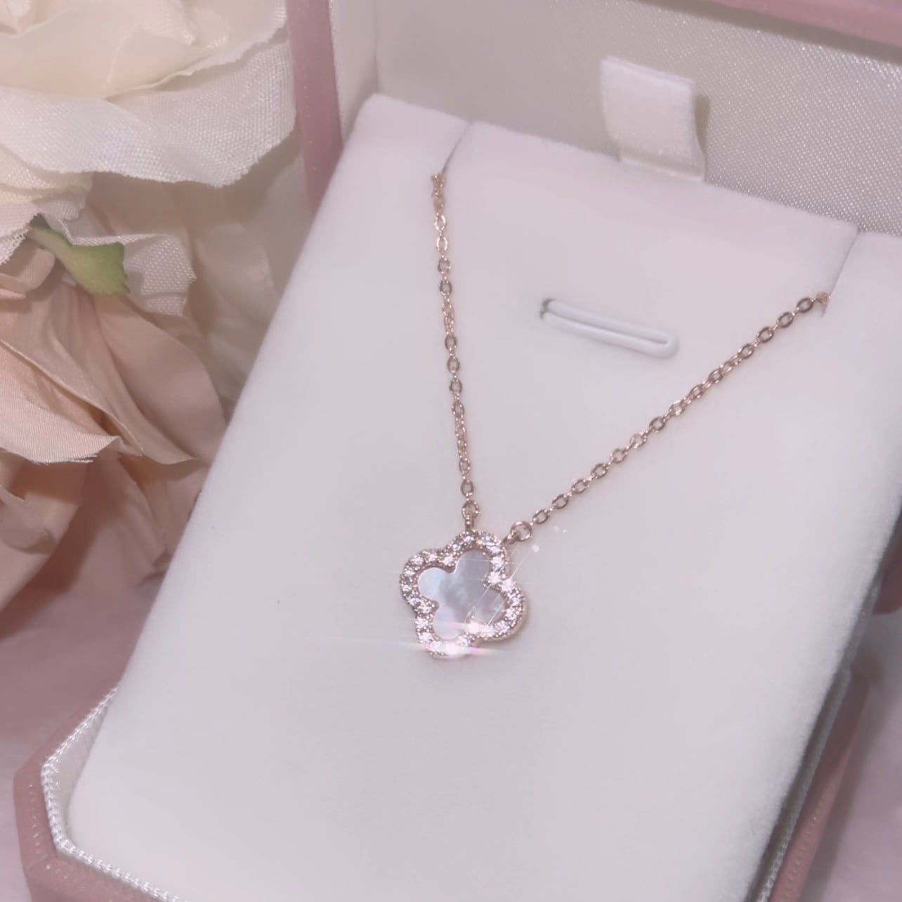 クローバーモチーフにジルコニアとホワイトシェルが施された美しいネックレスです。肌に優しく、日常から特別な日まで幅広くご使用いただけるスキンジュエリーとしておすすめです。輝きを放つデザインで、シンプルながらも存在感があります。