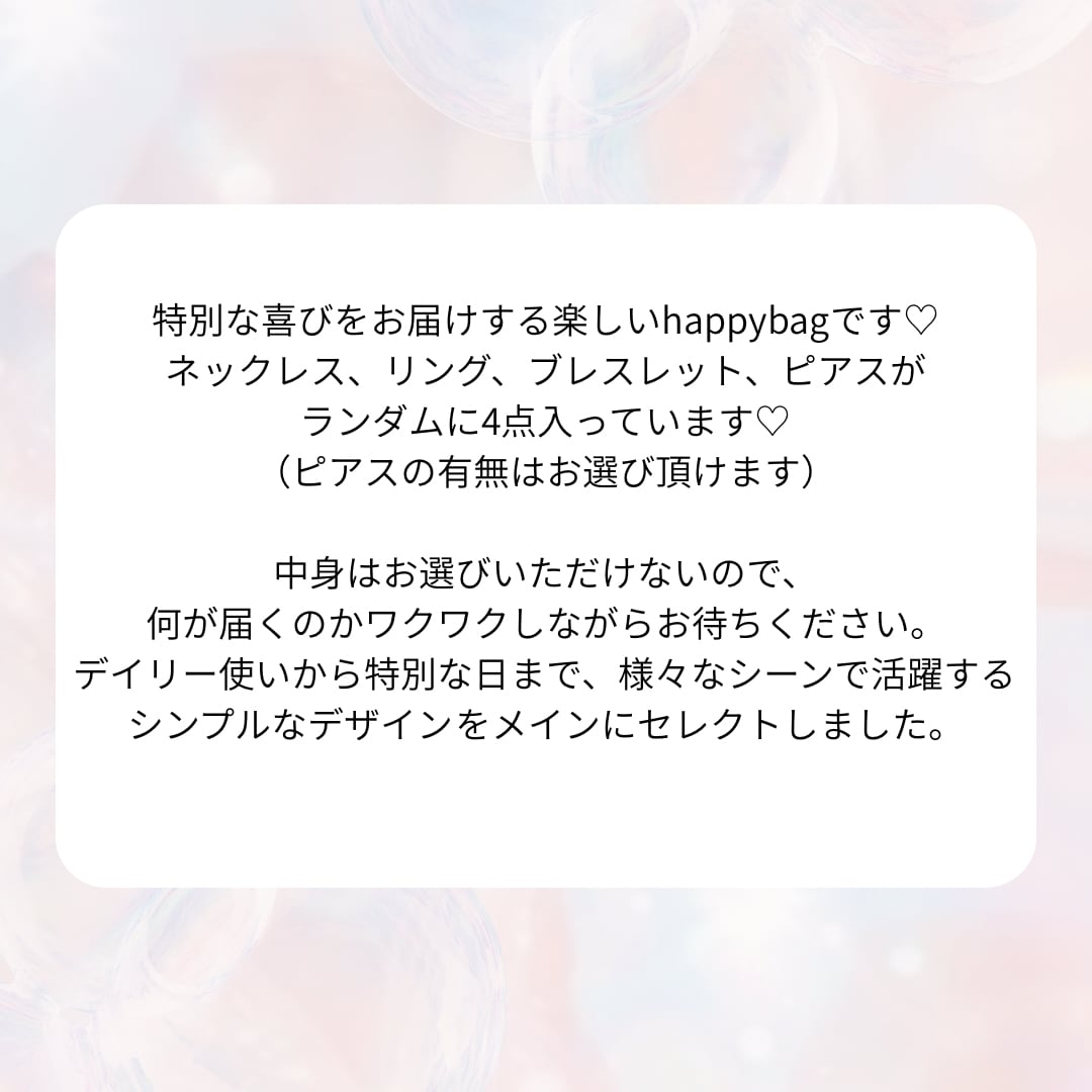 ネックレス、リング、ブレスレット、ピアスがランダムに4点入っています。(ピアスの有無はお選び頂けます)