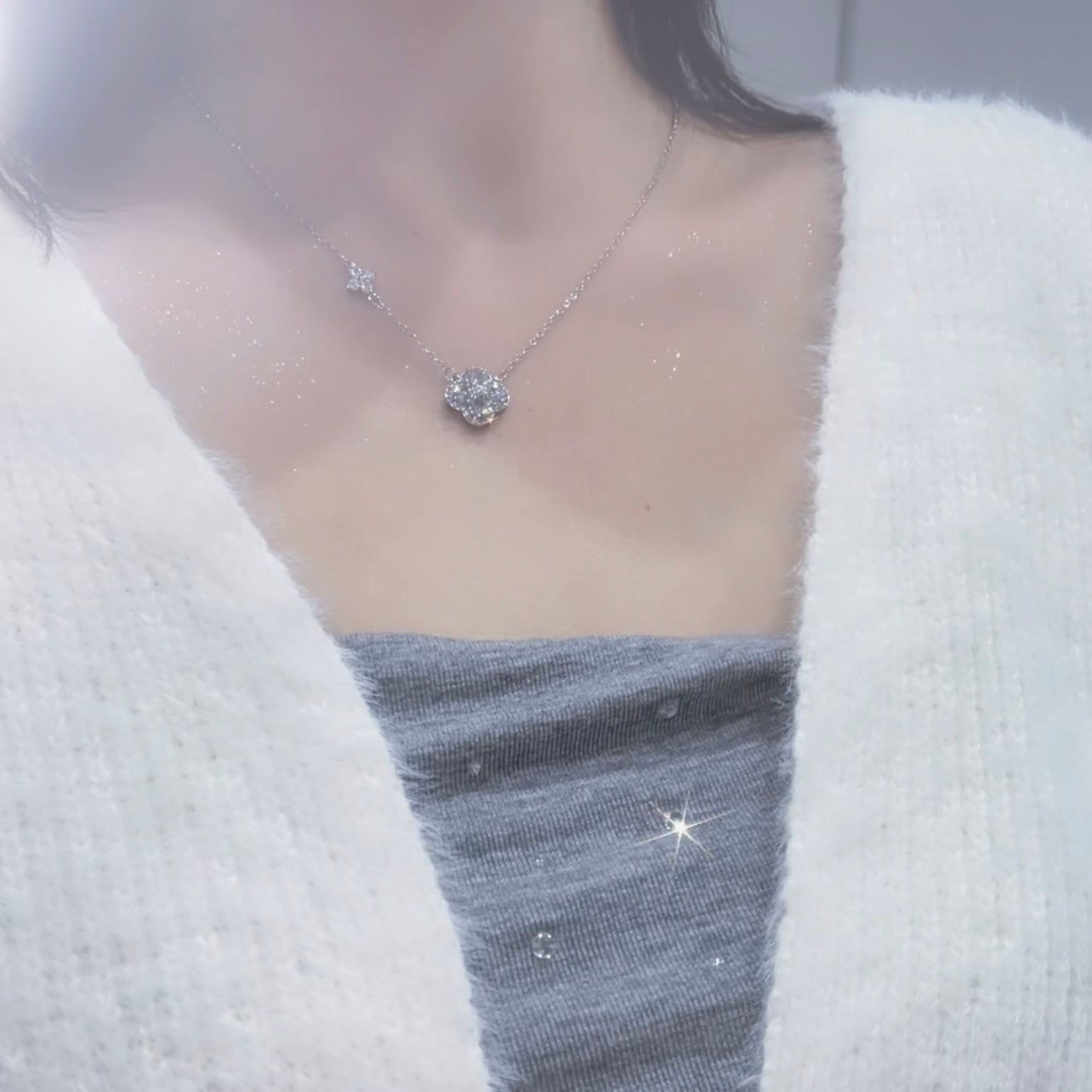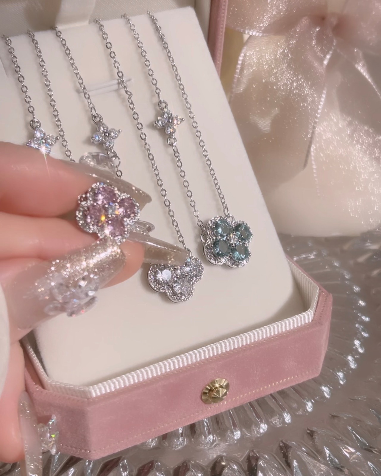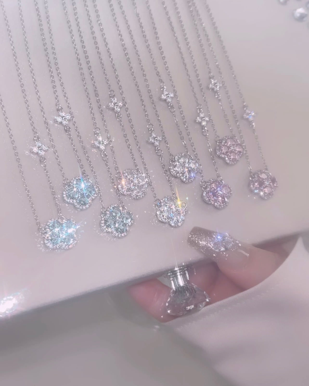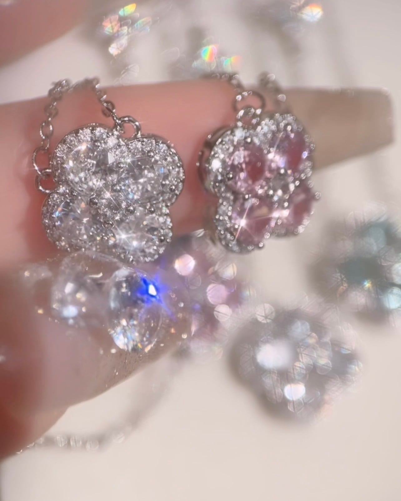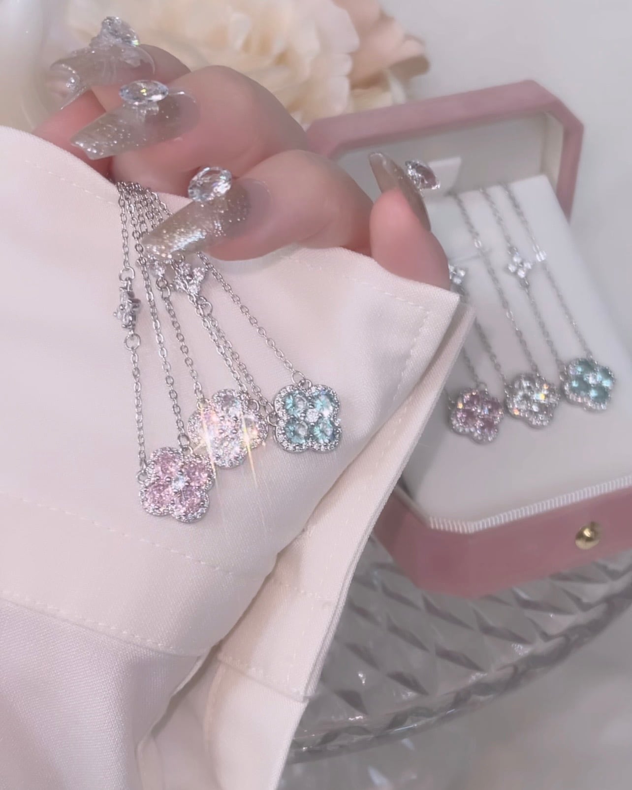 四つ葉のクローバーモチーフにジルコニアが輝くネックレス。
