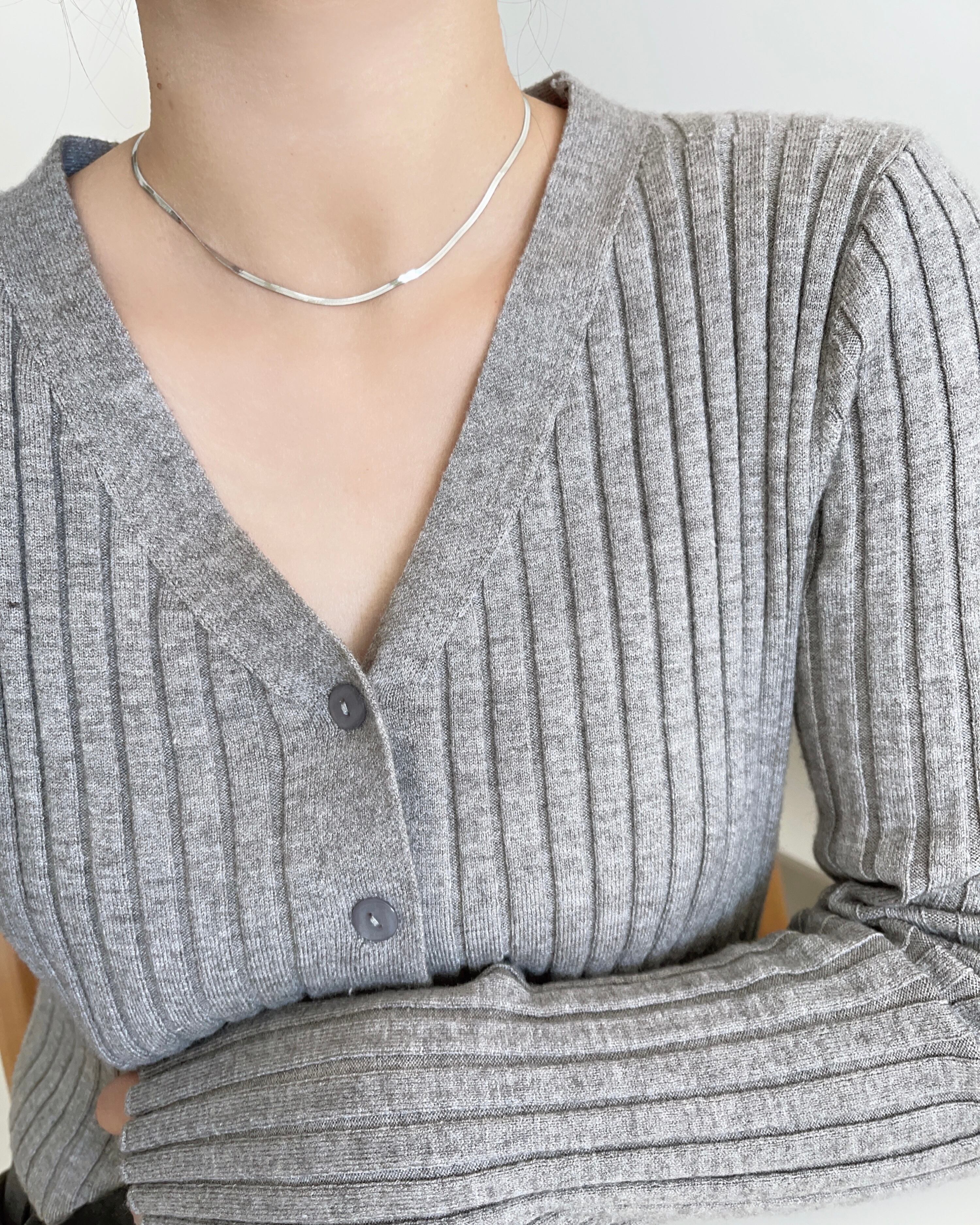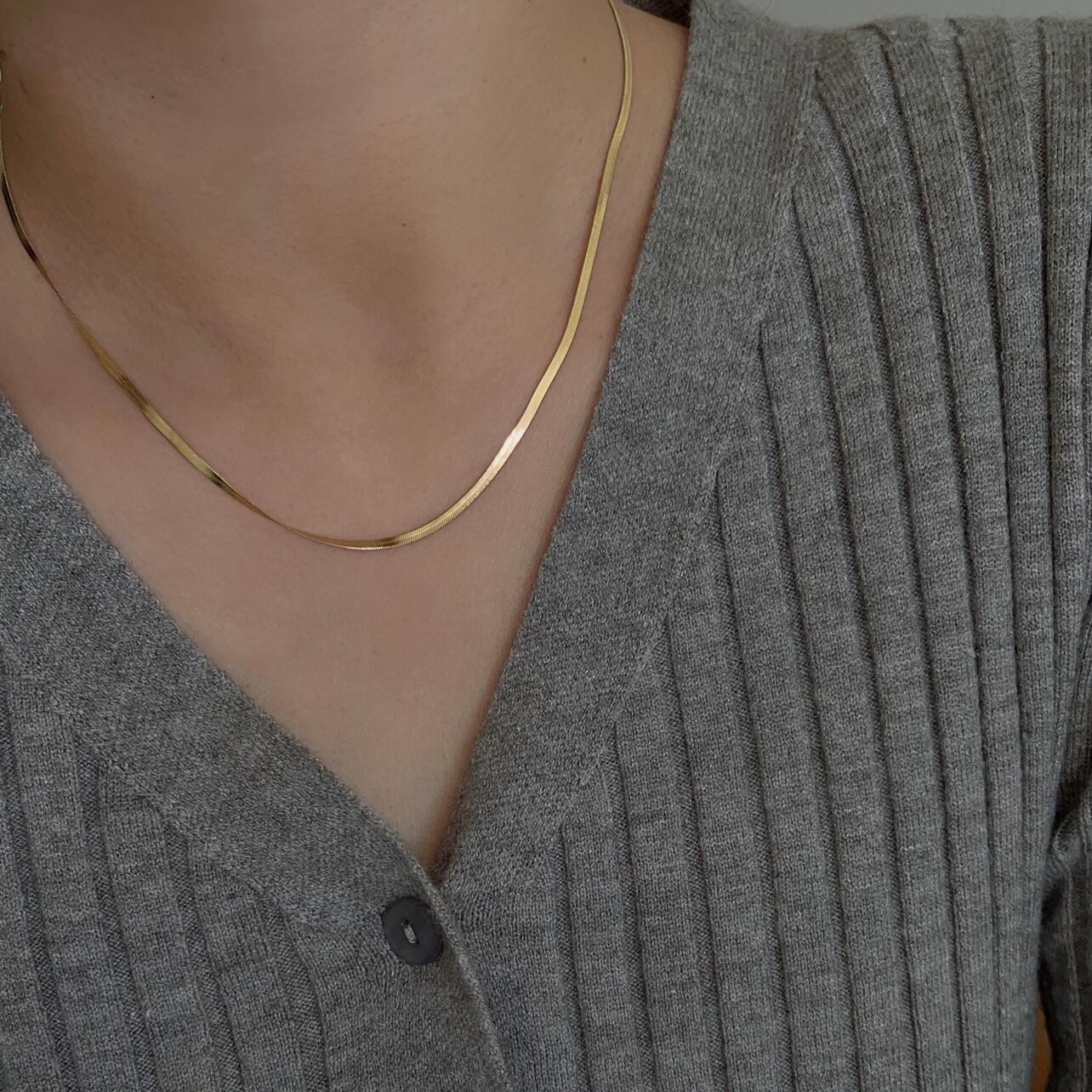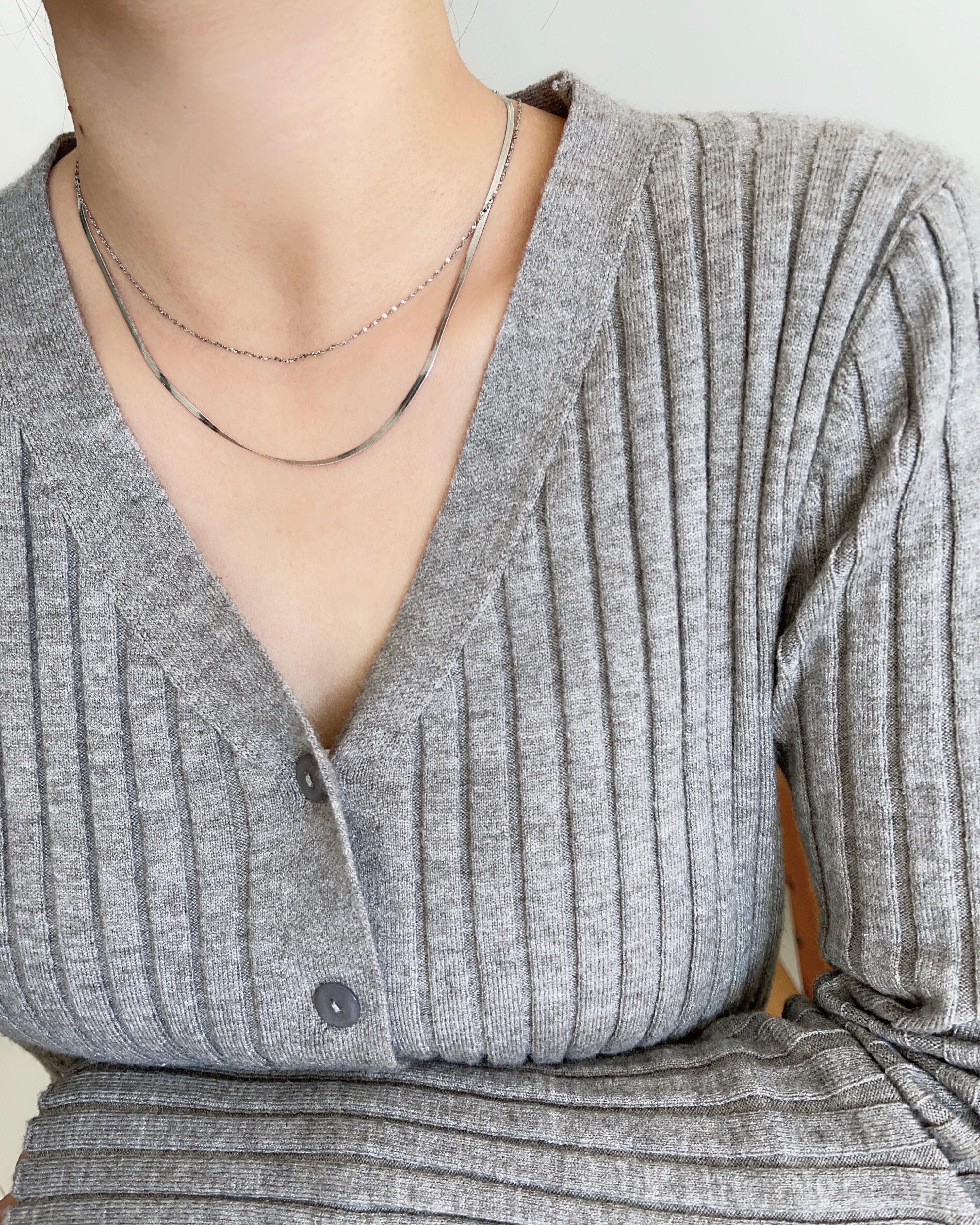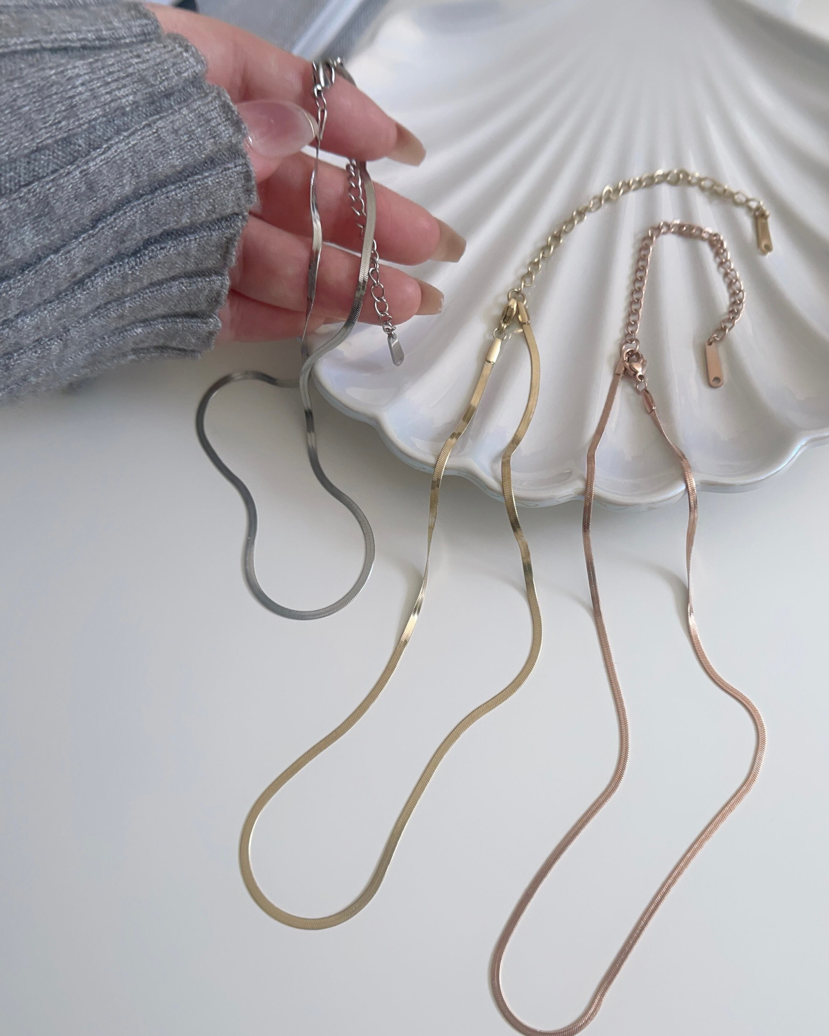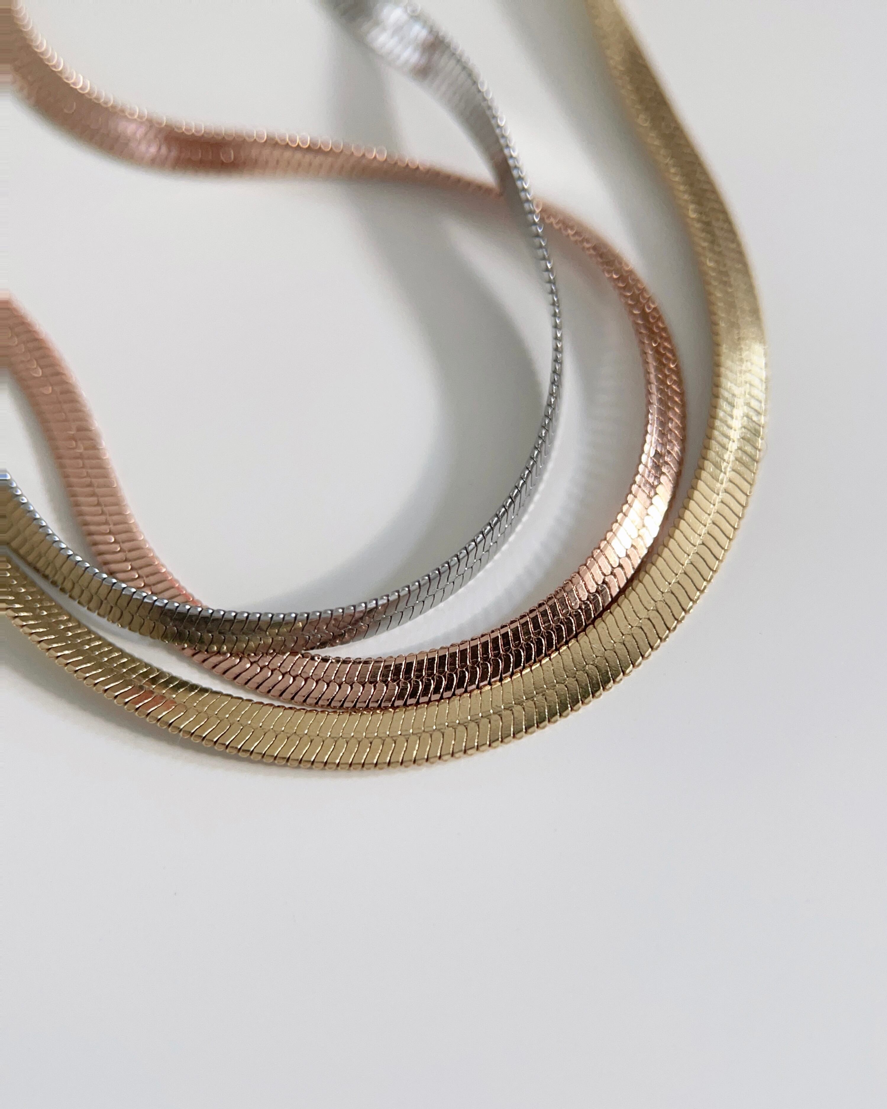 幅2㎜のスネークチェーンが存在感ありながらも上品なデザイン。光が当たると煌めきます。