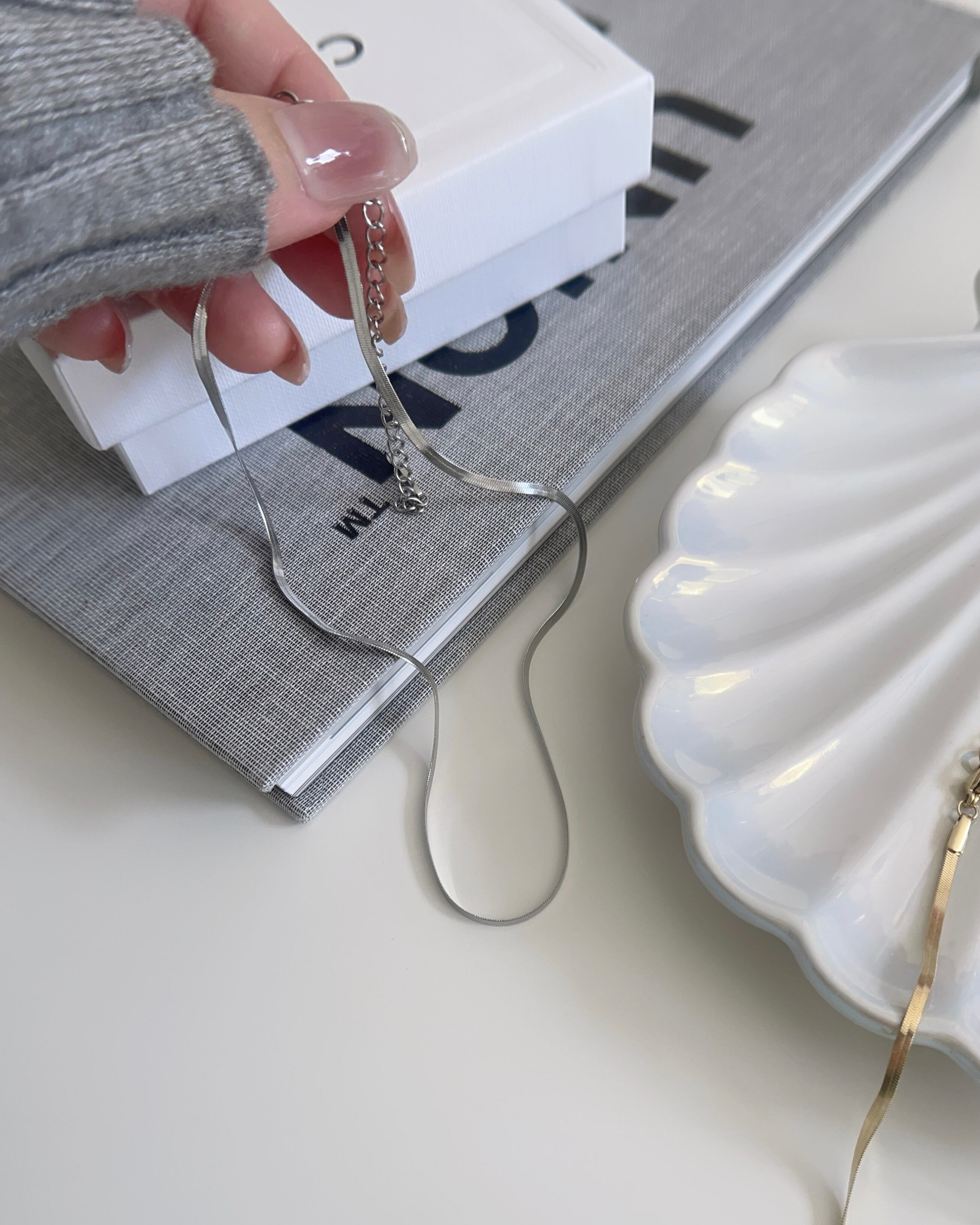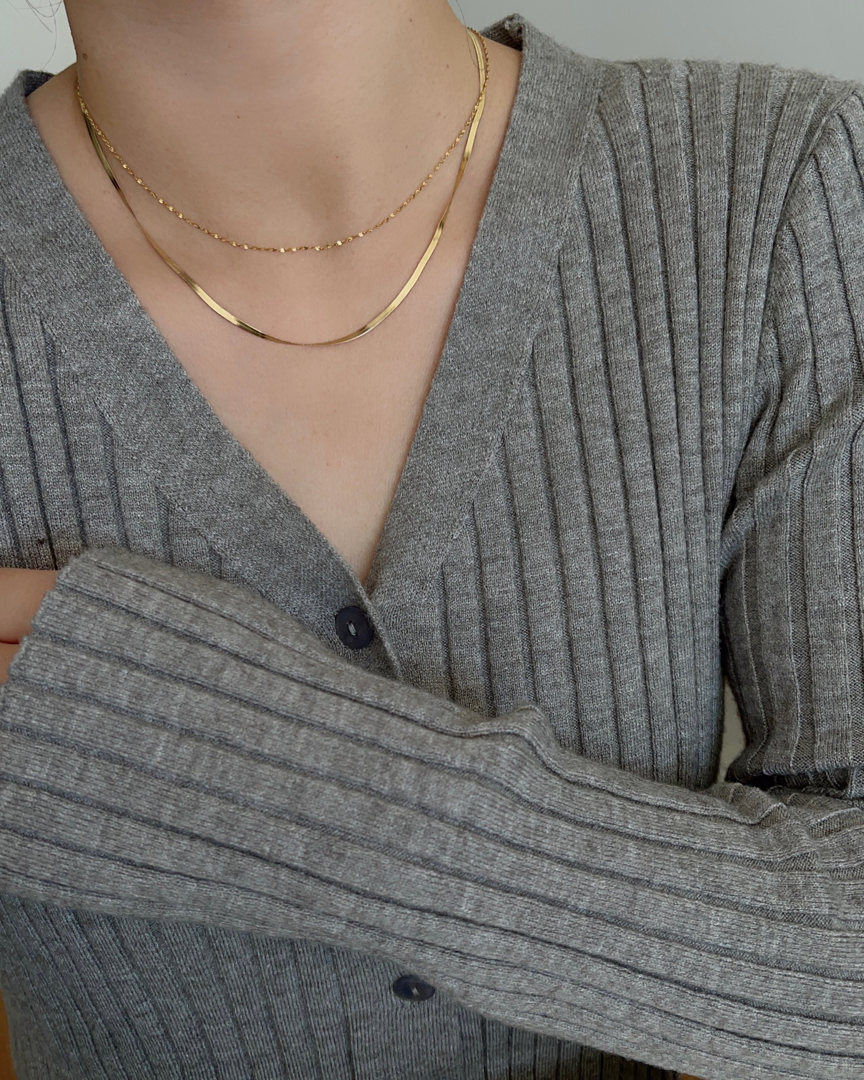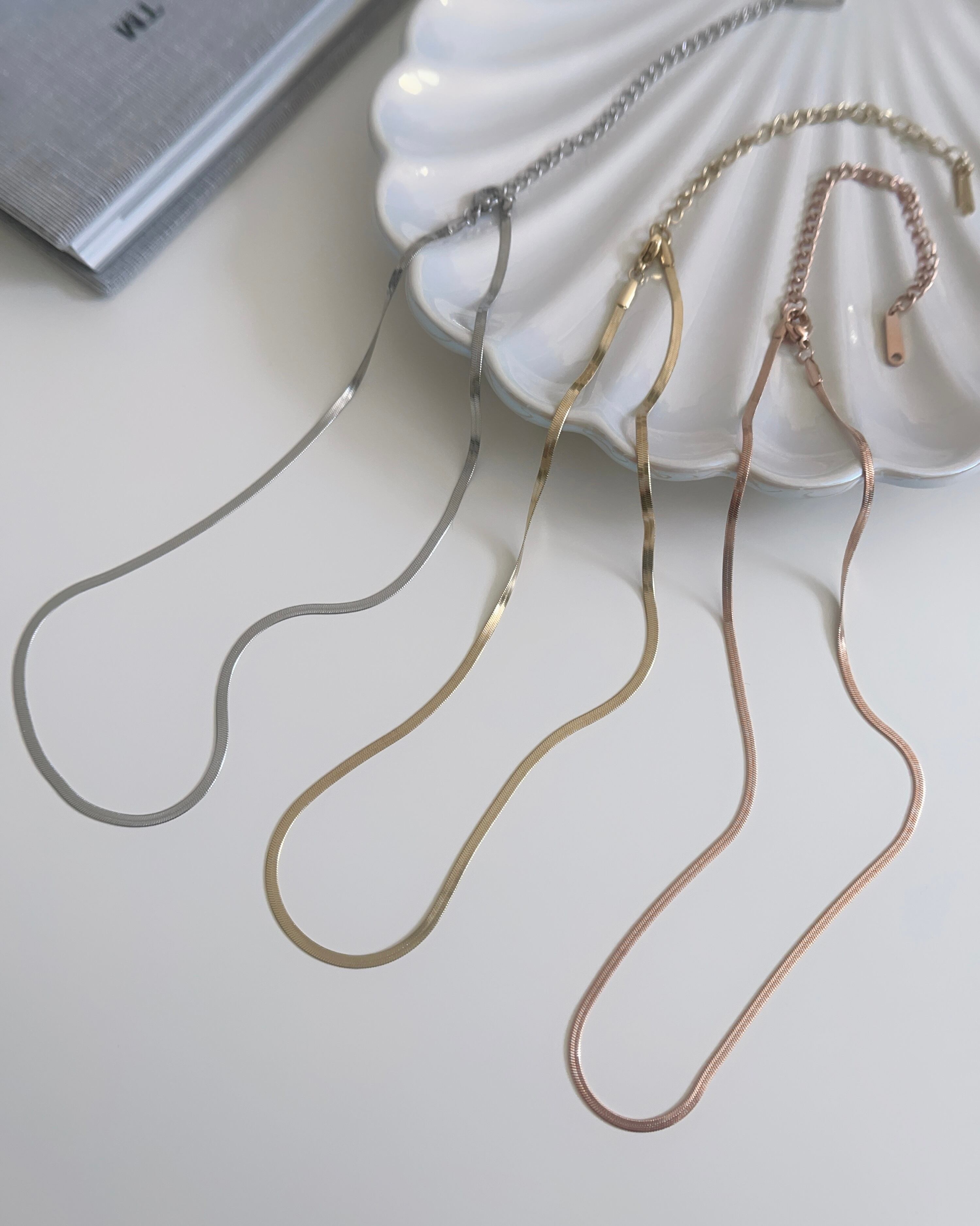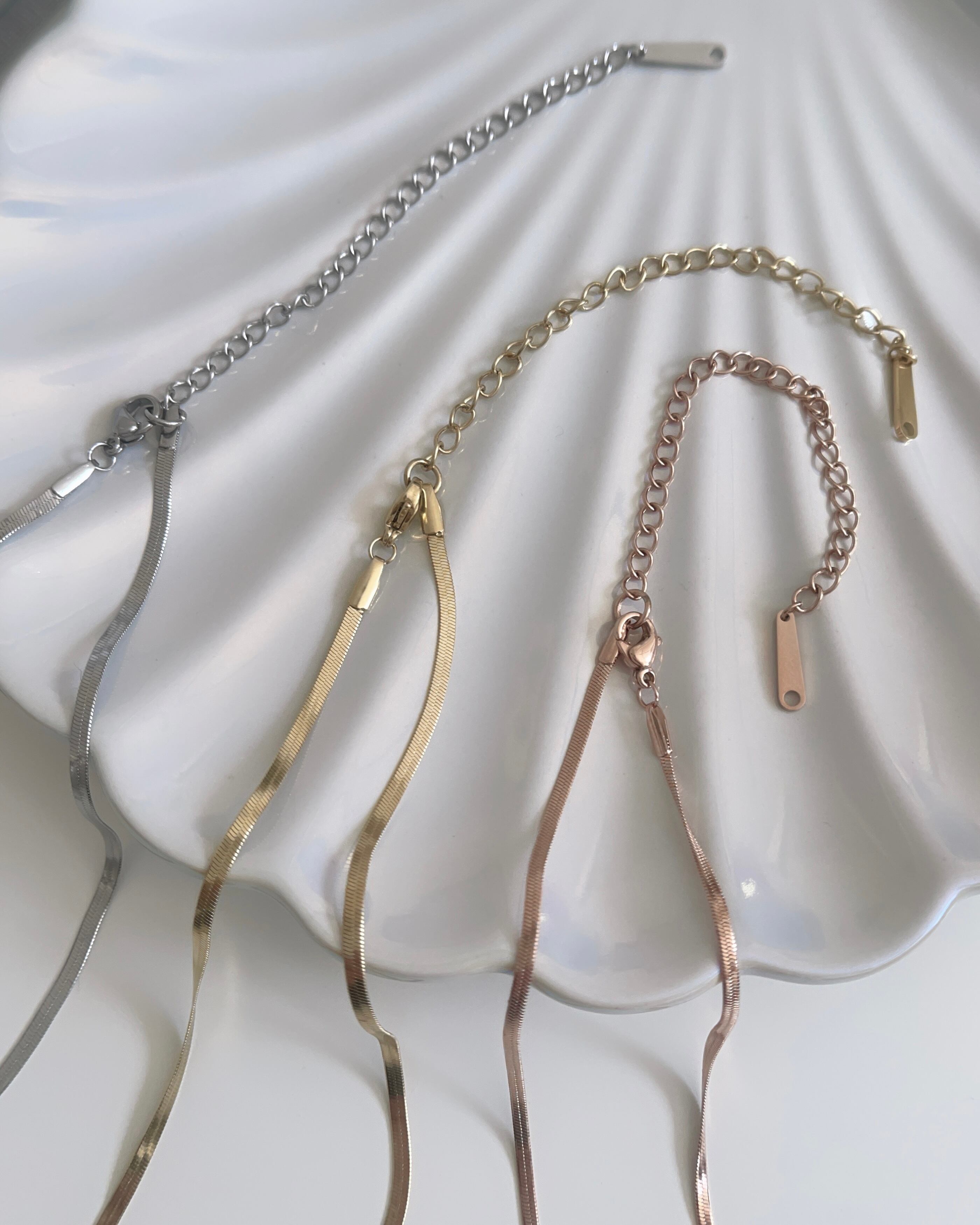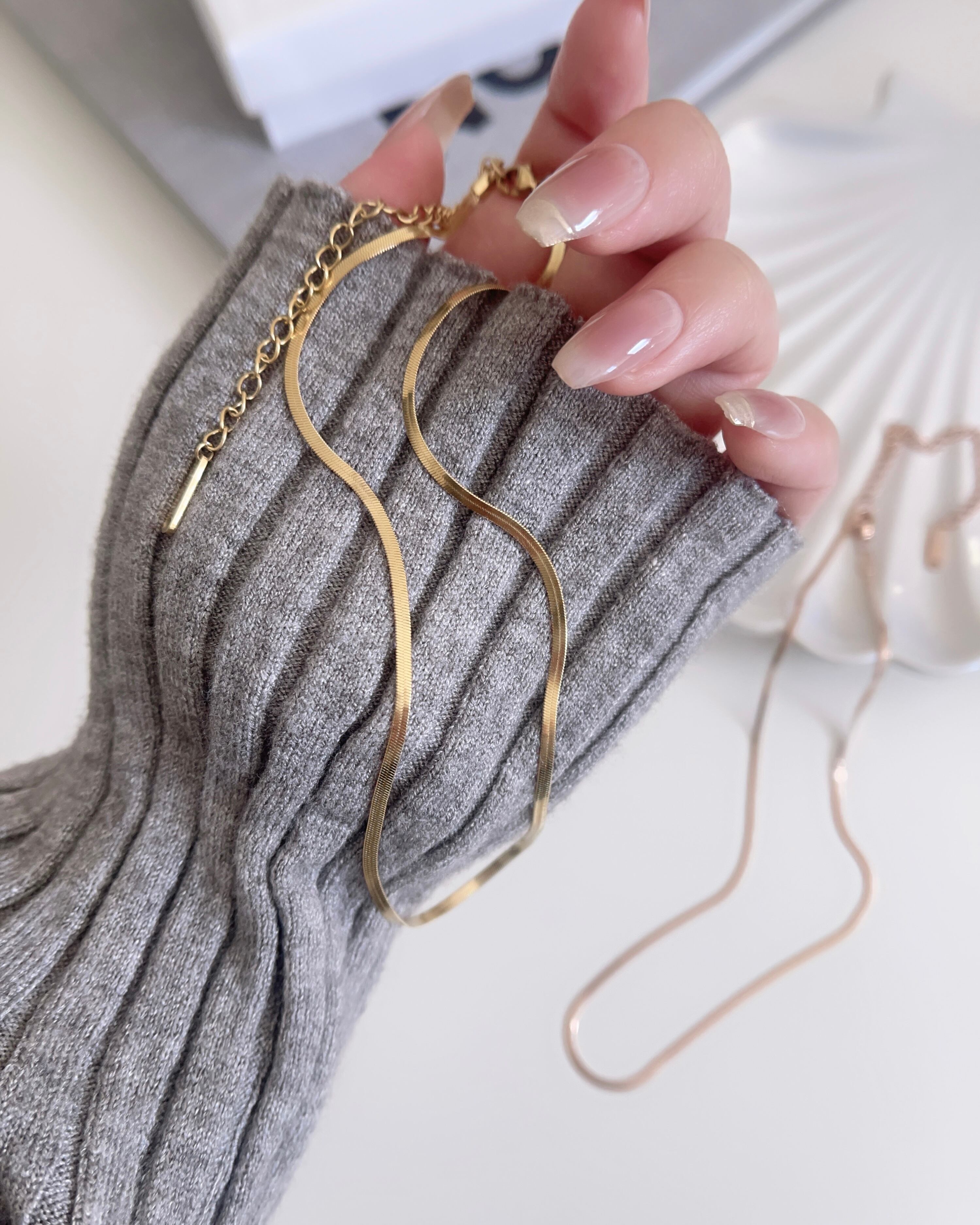 幅2㎜のスネークチェーンが存在感ありながらも上品なデザイン。光が当たると煌めきます。